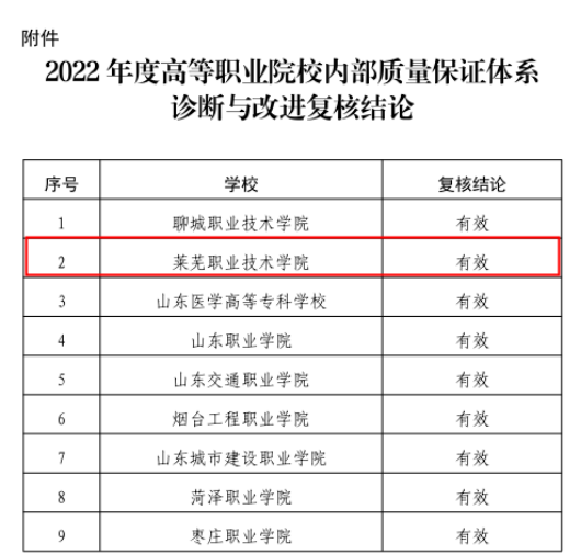 近日,山东省教育厅发布《山东省教育厅关于公布2022年度高等职业院校内部质量保证体系诊断与改进复核结论的通知》,对2022年全省9所职业院校诊改复核结果予以公布,学校顺利通过省高职院校诊断与改进专家委员会专家组复核,复核结论为“有效”。