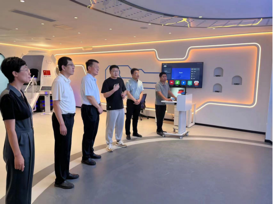 孔祥敏首先实地参观了美和易思数字产业创新实践中心,询问建设进展情况,详细了解建设理念及运行机制等。数字产业创新实践中心是以新一代信息技术专业群为教育教学基础,面向人工智能、大数据、云计算、物联网、区块链、5G通信、XR扩展现实、数字孪生等技术集成的数字生活空间元宇宙场景的综合应用实训室。目前,场地建设以及设备调试已全部到位,满足使用要求。