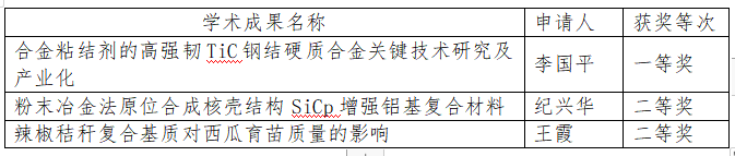 近日,济南市科学技术协会公布了第十七届济南市自然科学学术成果评选结果,我校共有3项成果获奖,成绩斐然。其中,李国平教师的“合金粘结剂的高强韧TiC钢结硬质合金关键技术研究及产业化”项目荣获一等奖,纪兴华老师的“粉末冶金法原位合成核壳结构SiCp增强铝基复合材料”项目和王霞老师的“辣椒秸秆复合基质对西瓜育苗质量的影响”项目荣获二等奖。