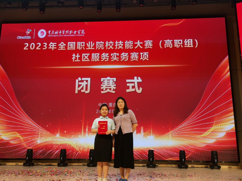 8月28日-29日,2023年全国职业院校技能大赛(高职组)“社区服务实务”赛项在重庆城市管理学院举办,医学技术与护理系护理专业学生袁思雨,在孟凌春教师团队的指导下,夺得了该赛项三等奖。