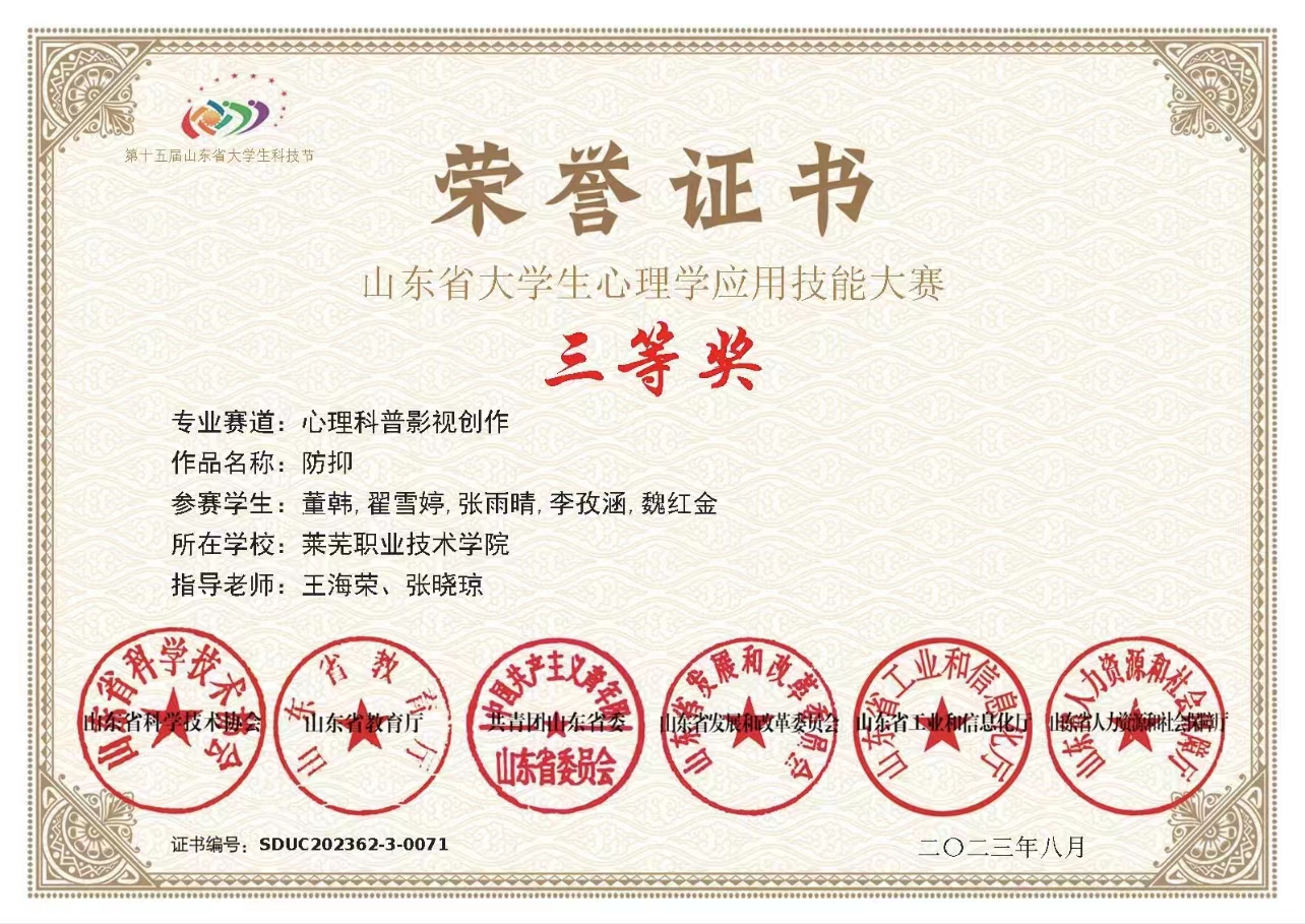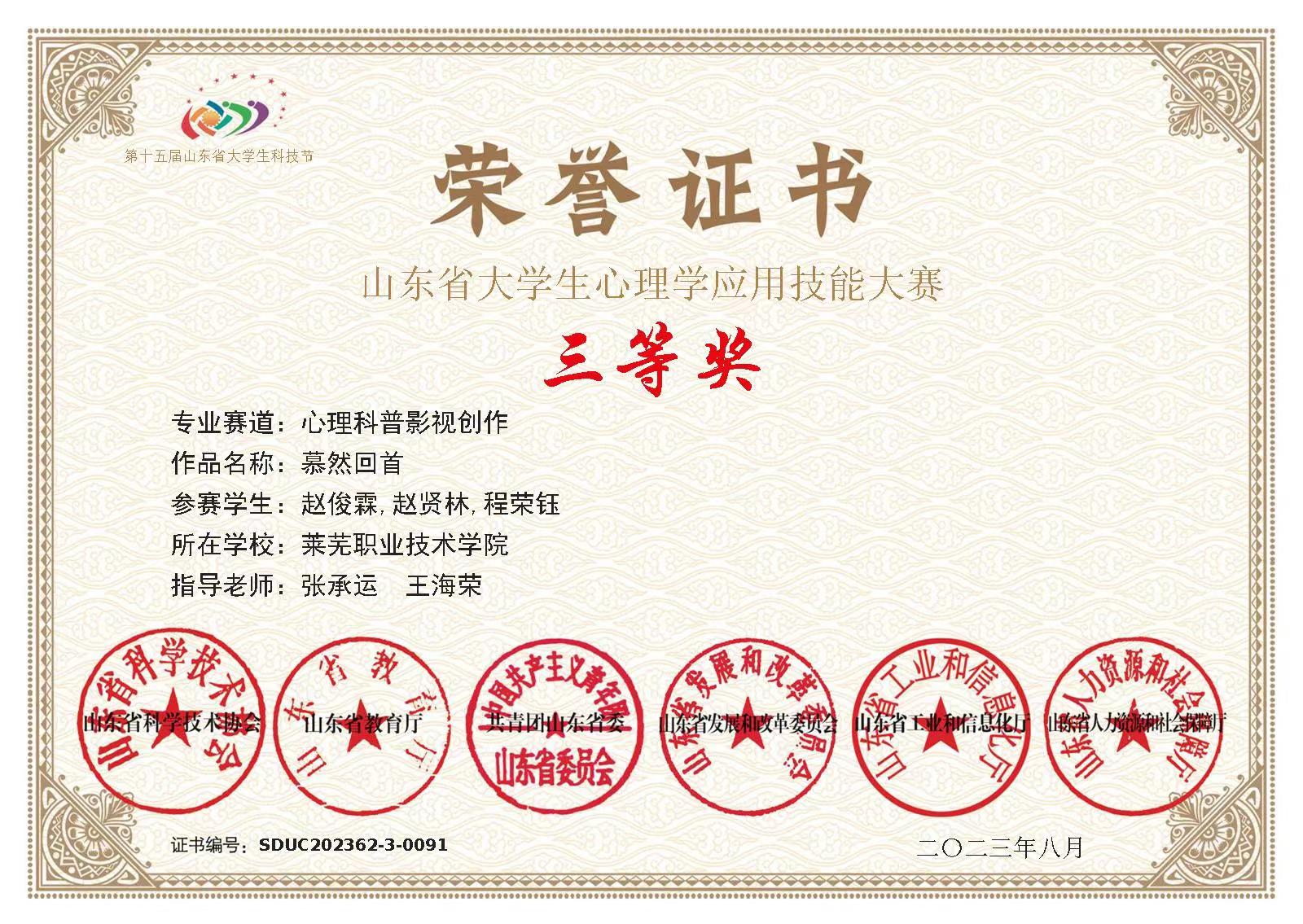 近日,由省科学技术协会、省教育厅等部门联合举办的第十五届山东省大学生科技节——心理学应用技能大赛落下帷幕,学校两件参赛作品《防抑》《蓦然回首》获得科普影视赛道三等奖。