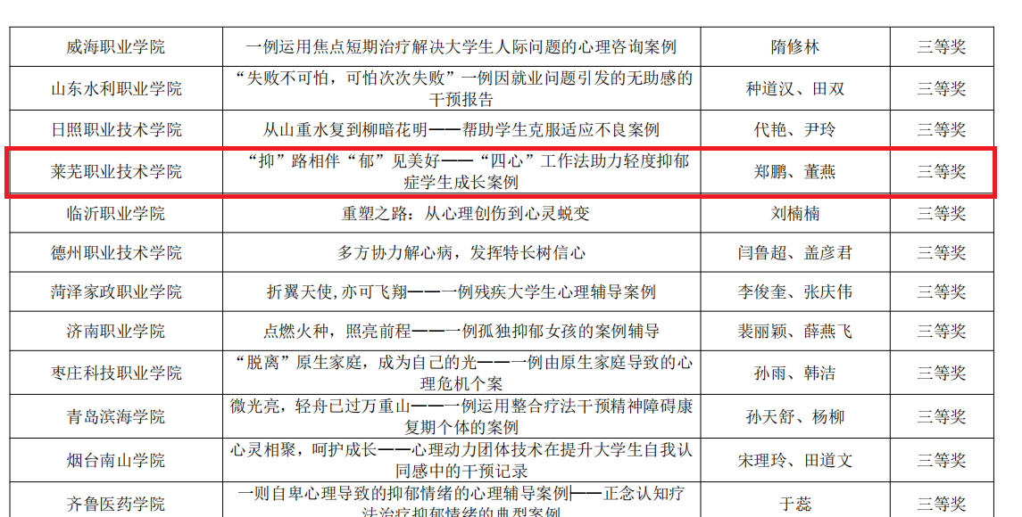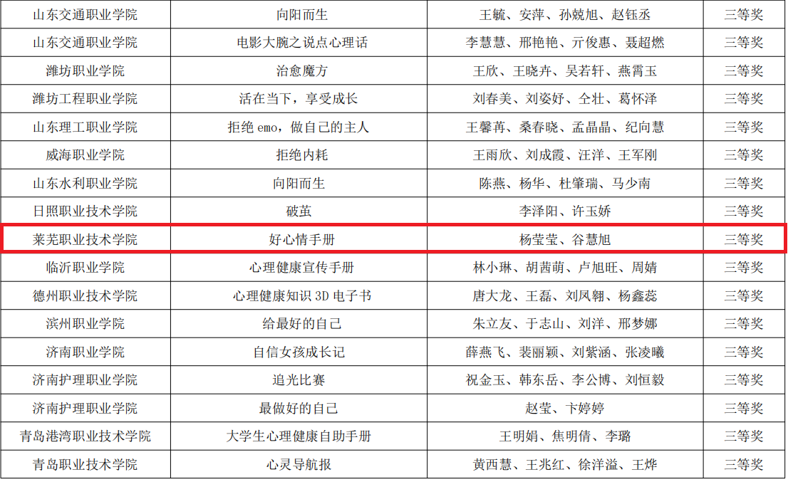 近日,山东省大学生心理健康教育专业委员会公布了2023年山东省高校心理健康教育月展示活动结果,学校3件作品获奖,其中,三行诗作品《芳华》荣获“致可爱的我和你”三行诗优秀作品展示一等奖,《好心情手册》荣获心理健康主题宣传作品评选展示三等奖,《“抑”路相伴“郁”见美好--—“四心”工作法助力轻度抑郁症学生成长案例》荣获优秀心理辅导案例三等奖。