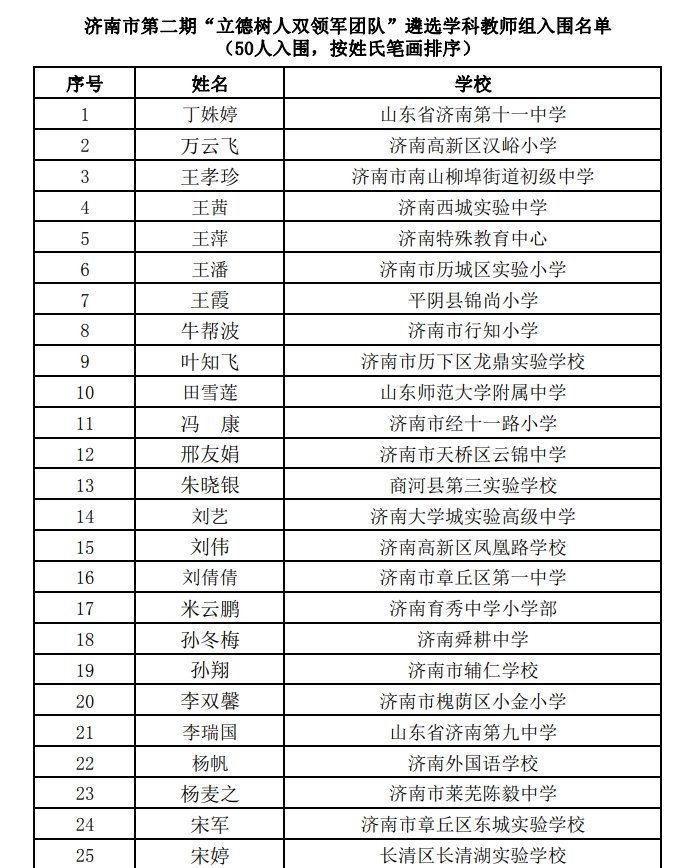 济南市“立德树人双领军团队”建设工程旨在通过遴选培育“班主任”和“学科教师”育人领军团队,着眼于全员育人、全过程育人、全方位育人,进一步提高德育工作的实效性,带动全市班主任和学科教师德育能力的提高。本次评选经学校申报、区县教育部门遴选推荐、聘请外省专家独立进行材料评审和现场集中面试答辩等程序,最终全市大中小学50名教师入围学科教师组“立德树人双领军团队”。