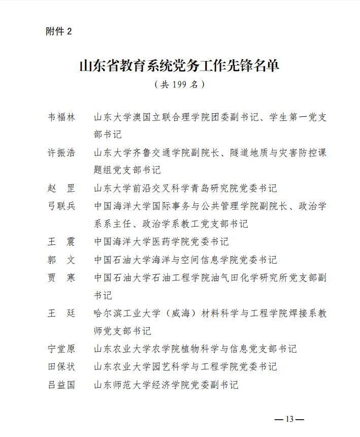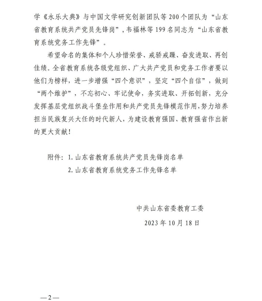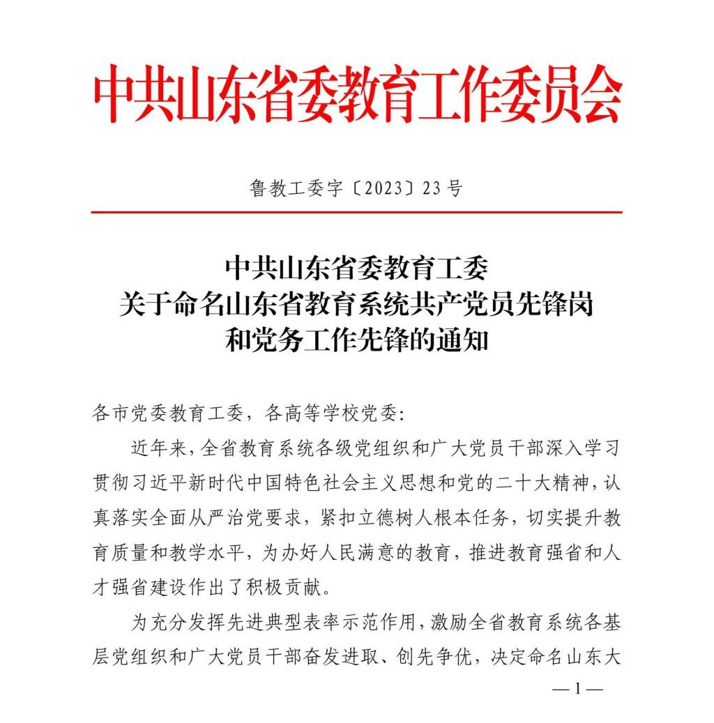 根据《关于开展全省教育系统党务工作先锋共产党员先锋岗遴选工作的通知》(鲁教工委函〔2023〕33号)要求,经学校推荐、考察、上级评审等环节,全省共评选 200 个团队为“山东省教育系统共产党员先锋岗”,199 名同志为“山东省教育系统党务工作先锋”。