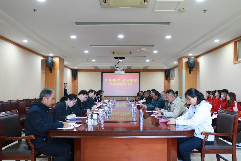 11月6日下午,学校召开2023年山东省大学生体育联赛获奖师生代表座谈会。党委副书记、院长徐运国出席会议并讲话,副院长邹翠兰主持会议,党委宣传部、党委学生工作部、教务处、基础教学部等相关单位负责人、获奖师生代表参加会议。