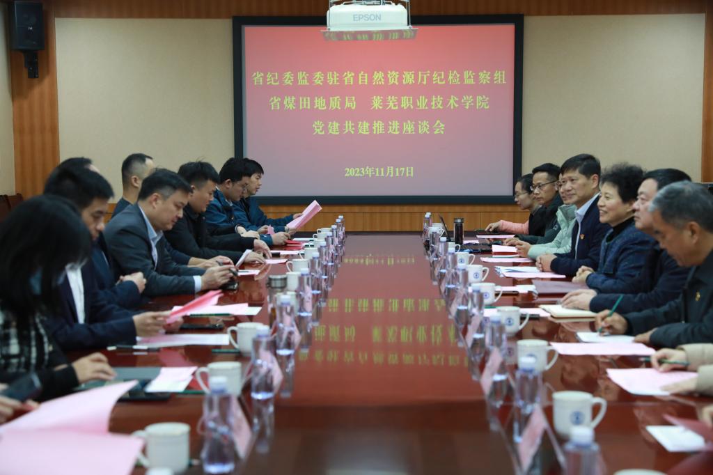 11月17日上午,省纪委监委驻省自然资源厅纪检监察组副组长、党支部书记、一级调研员王平,省煤田地质局机关党委副书记、直属机关纪委书记、二级调研员张文涛,省煤田地质规划勘察研究院党委书记、理事长李小彦等一行12个人来学校交流调研,开展党建共建座谈会。学校纪委书记(监察专员)付萍,党委组织部部长贾友军和基础教学部相关负责人参加座谈会。座谈会由付萍主持。