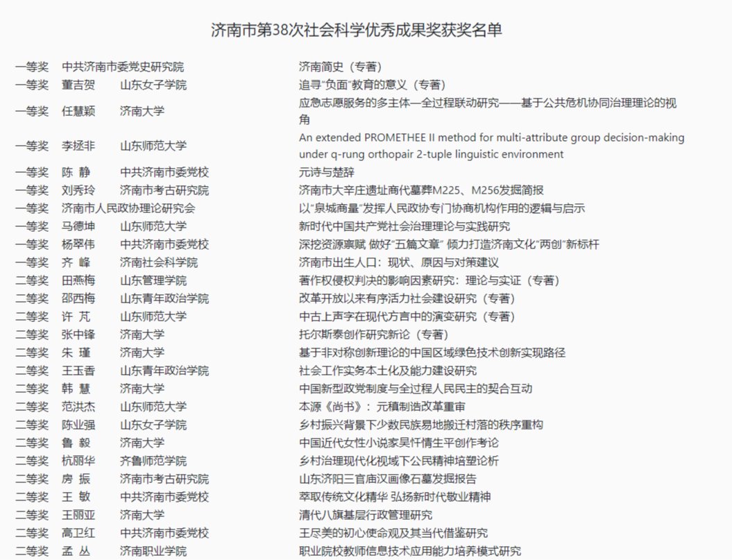 在本次评选工作中,来自驻济本、专科高校和各市直单位的共计80项成果荣获奖励,济南市属高职院校共有6项成果获奖。评选工作启动以来,学校积极组织优秀科研成果申报参评,经过层层选拔,相关成果脱颖而出。从获奖结果来看,学校哲学社会科学科研成果特色鲜明、优势突出,学术影响力和竞争力不断增强。