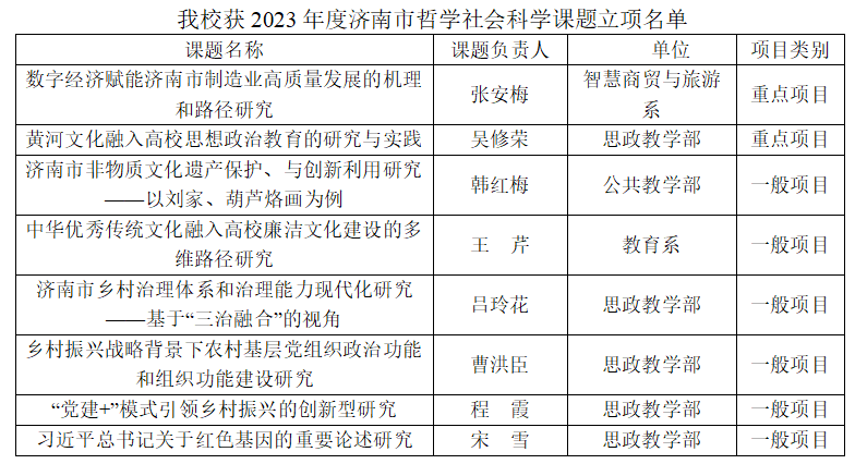 近日,济南市哲学社会科学工作办公室公示了2023年度济南市哲学社会科学课题立项名单,我校有8项课题获得立项,其中重点课题2项,一般课题6项,立项数量是2022年的2倍,实现大突破。