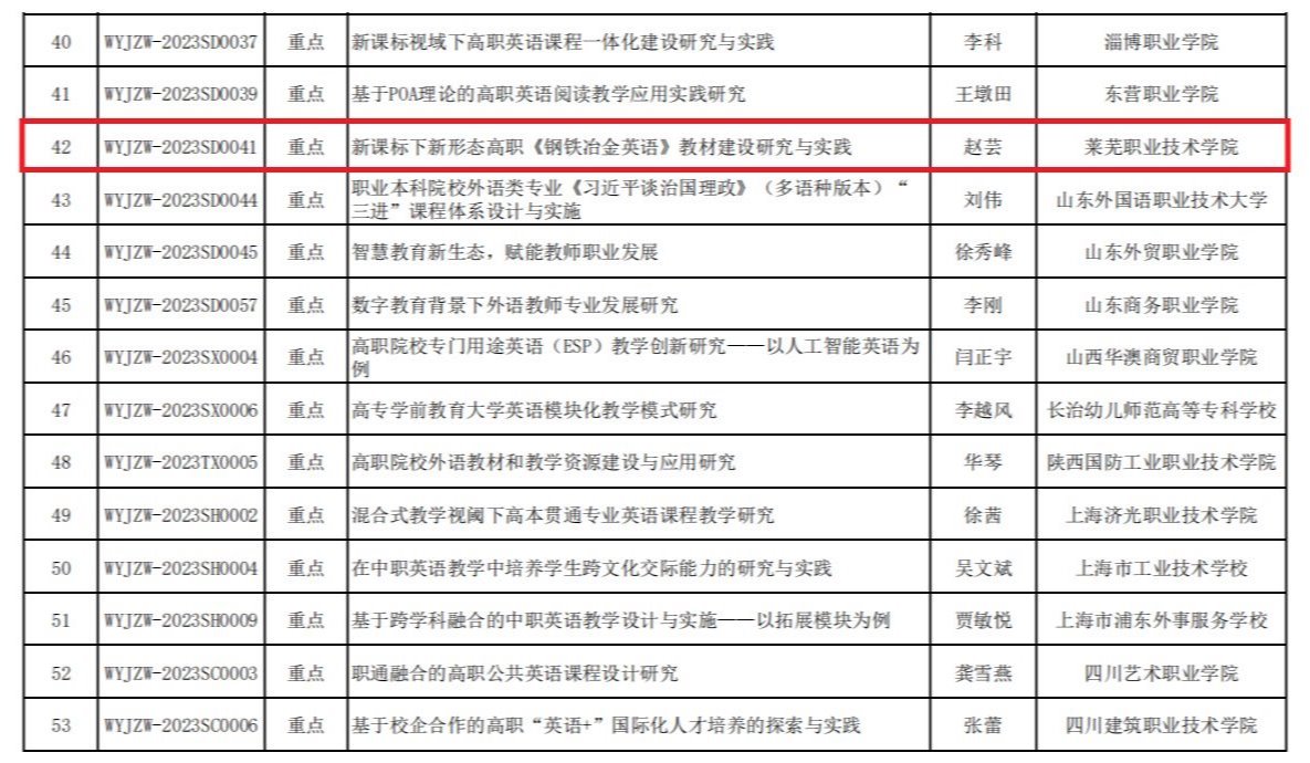 公共教学部赵芸老师申报的《新课标下新形态高职<钢铁冶金英语>教材建设研究与实践》立项重点课题;吕凤华老师申报的《新课标下高职公共英语服务于新工科建设的课程设计与策略研究》立项一般课题。