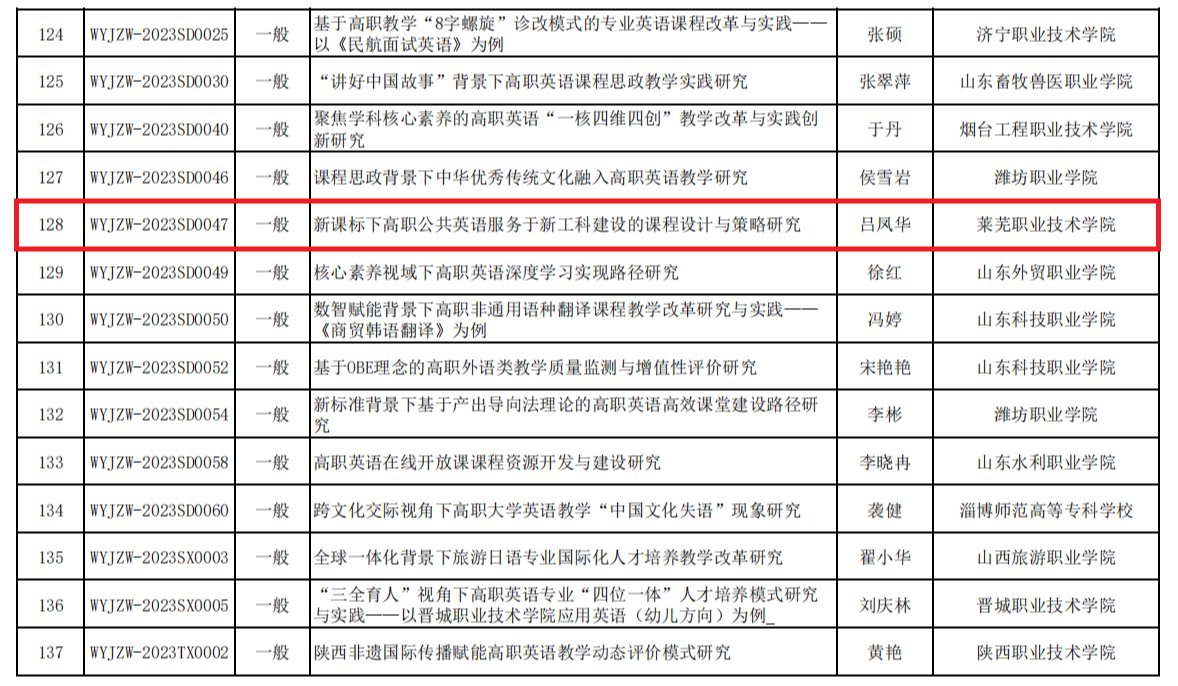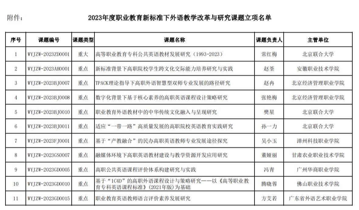 近日,教育部职业院校外语类专业教学指导委员会下发《关于公布2023年度职业教育新标准下外语教学改革与研究课题立项名单的通知》,学校立项重点课题、一般课题各1项。本次立项重点课题全国高职院校共62项,一般课题全国高职院校共116项。