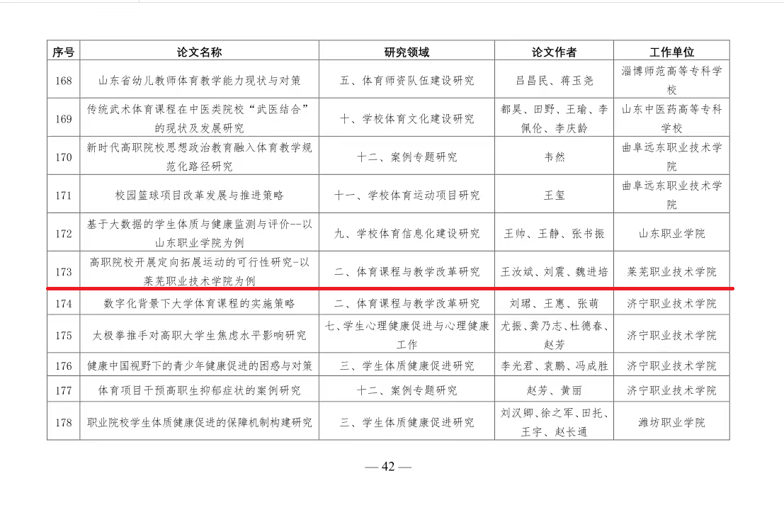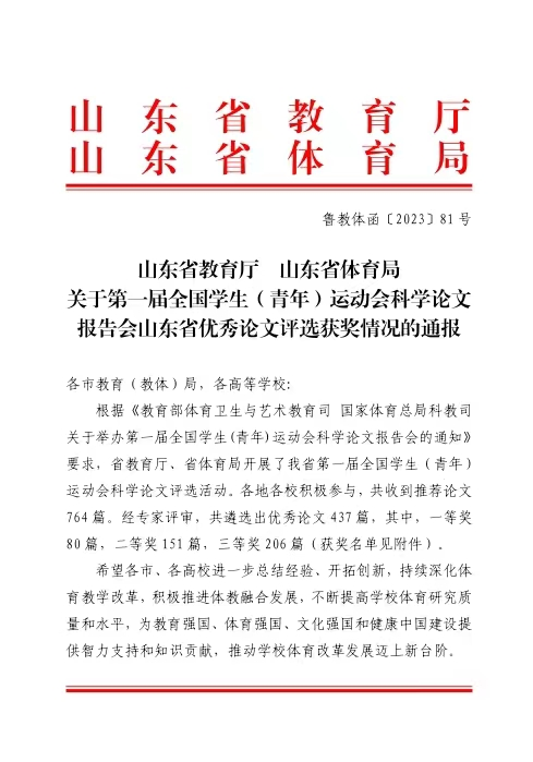 近日,学校收到省教育厅和省体育局联合下发的《关于第一届全国学生(青年)运动会科学论文报告会山东省优秀论文评选获奖情况的通报》,公共教学部报送的体育课程与教学改革研究类别论文《高职院校开展定向拓展运动的可行性研究-以beat365在线唯一官网为例》荣获全省学校三等奖。