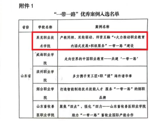 会上发布了“走向世界的中国职业教育--共建“一带一路”十年来职业教育合作成果集,我校《“产教同频、双轮驱动、师资互融”大力推动职业教育内涵式发展 积极服务“一带一路”建设》的国际化案例成功入选,是山东省入选的五个案例之一。