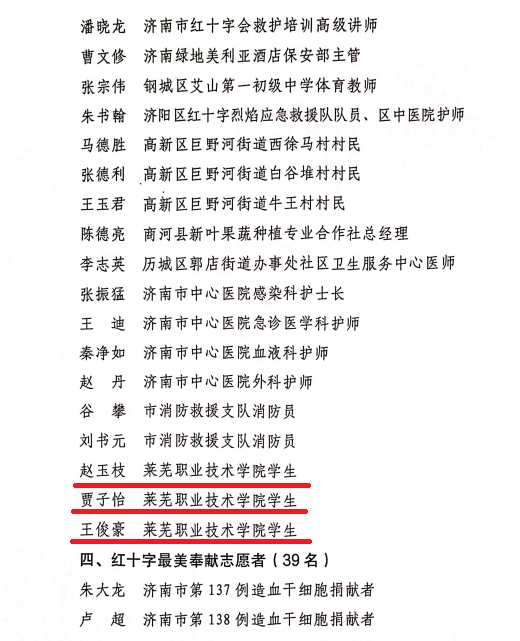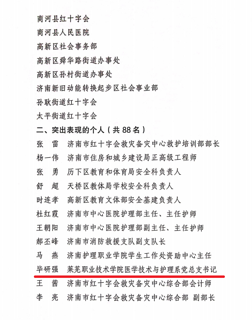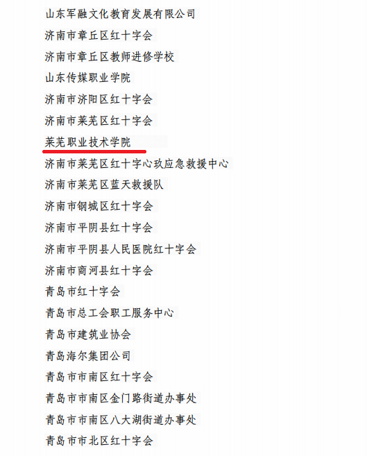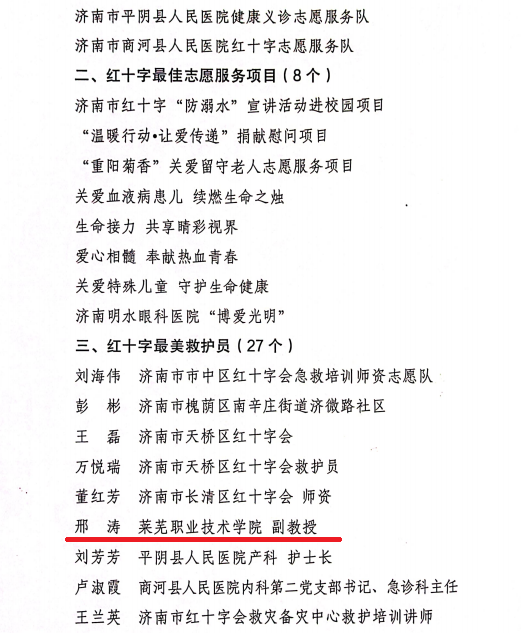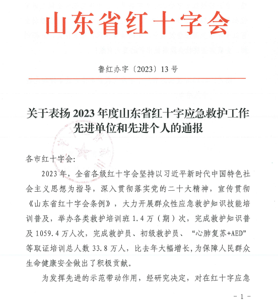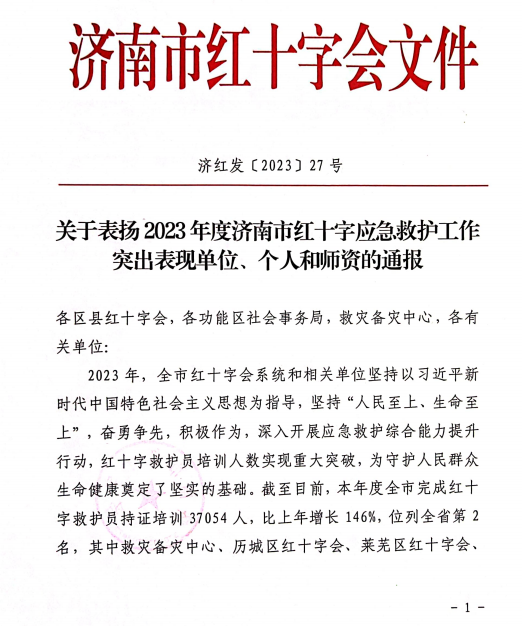 近日,山东省红十字会、济南市红十字会发布文件,表扬2023年在应急救护工作做出突出贡献的单位与个人。学校被山东省红十字会授予“2023年度山东省红十字会应急救护工作先进单位”,被济南市红十字会授予“2023年度济南市红十字会应急救护工作突出表现的单位”,其中1人被授予“2023年度山东省红十字会应急救护工作先进个人”,1人被授予“2023年济南市红十字会应急救护工作突出表现个人”,8人被评为“突出表现师资”,4人被济南市红十字会授予“红十字最美救护员”荣誉称号。