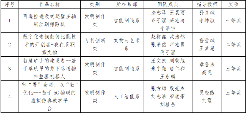 近日,第十八届全国高职院校“发明杯”大学生专利创新大赛圆满落幕,学校共有4项作品获奖,其中一等奖1项,二等奖1项,三等奖2项。