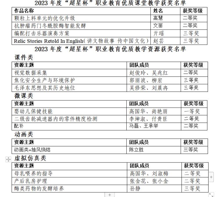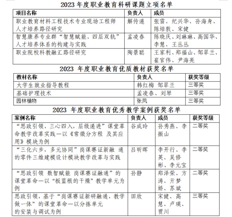 近日,省职业技术教育学会发布《关于公布2023年度职业教育提质培优工程项目评选(立项)结果的通知》,学校立项职业教育科研课题3项,优质教材奖三等奖3项,优秀教学案例二等奖3项、三等奖1项,优质课堂二等奖2项、三等奖2项,优质教学资源一等奖1项、二等奖5项、三等奖4项。