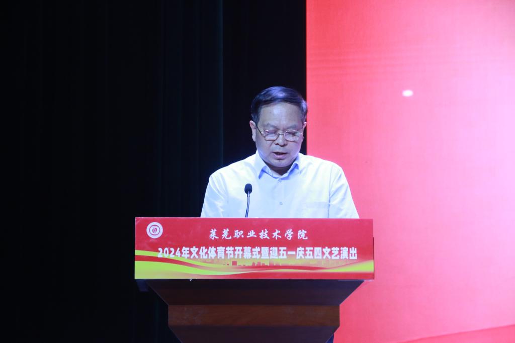 徐运国在开幕词中指出,举办文化体育节是贯彻落实习近平新时代中国特色社会主义思想,践行习近平总书记关于科技创新、文化传承、体育强国、艺术发展一系列新思想、新论断、新要求的重要举措,也是学校构建“大思政”全环境立德树人格局,提升校园文化建设的重要抓手。文化体育节已然成为学校特色鲜明、深受学生喜爱的活动品牌。在历届文化体育节中,学校始终坚持寓教于乐,将文化展示与思想引领、科技创新、劳动教育、体育拓展等有机融合在一起,使文化体育节成为弘扬学校校园文化、展示育人成果的重要窗口,成为广大师生相互切磋技艺、促进共同发展的有效平台。希望全体学生敢想敢为,展示自我,拓展边界,突破自我,见贤思齐,成就自我,在这个大舞台上释放青春激情、追逐青春理想,实现自我增值和新的超越。