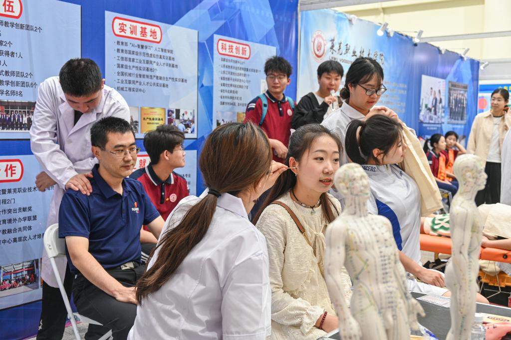 推拿技术与耳穴疗法是两项传统康复医学中应用较为广泛的康复治疗技术。医学技术与护理系现场展示了推拿与耳穴疗法,吸引了现场观众排队体验。