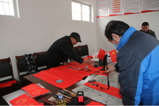 随行的学院工会主席刘永业、师范教育与艺术系教师李学笃在各村现场挥毫泼墨,为村民们书写春联,为大家送上新春最美好的期盼。