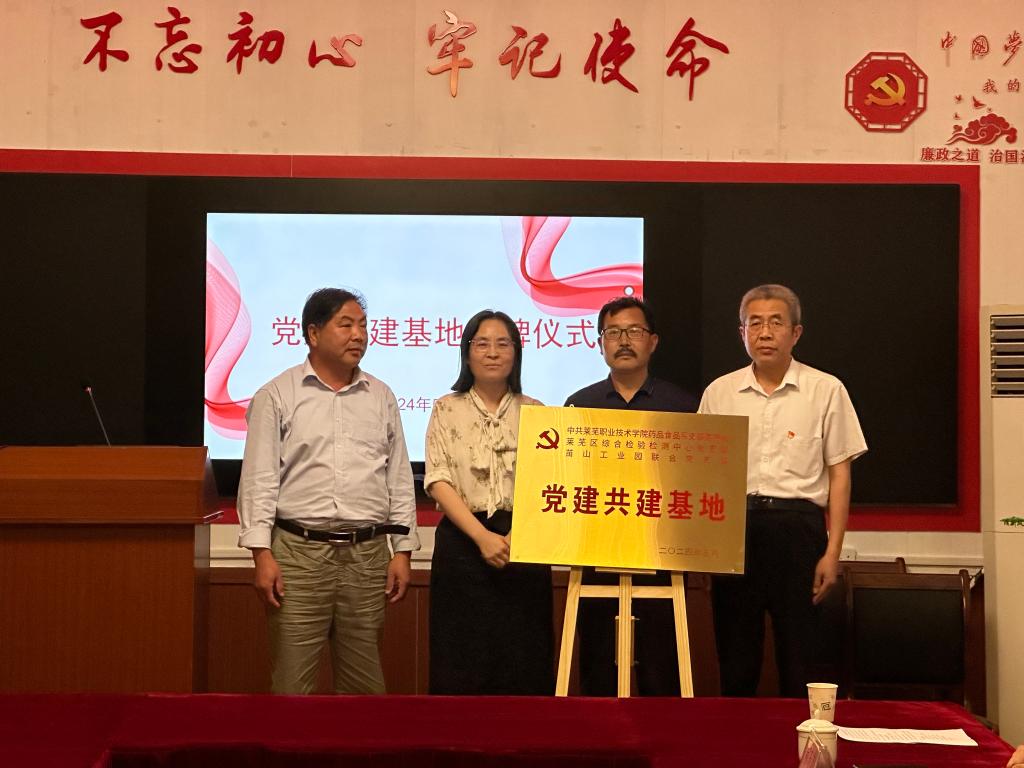 孙燕与莱芜区综合检验检测中心主任孙式奎、莱芜紫光生态园有限公司经理李奉胜、药品食品系党支部书记王锋祥共同为“党建共建基地”揭牌。