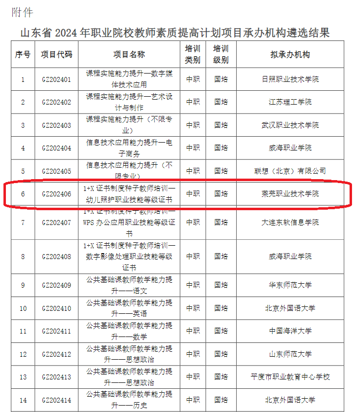 近日,山东省职业技术教育师资培训中心发布《关于山东省2024年职业院校教师素质提高计划项目承办机构遴选结果的公示》,学校成功获批中职“1+X证书制度种子教师培训—幼儿照护职业技能等级证书”国培项目,计划培训名额30人,获上级财政经费支持31.5万元。