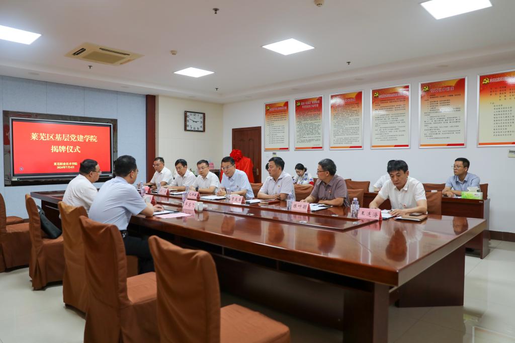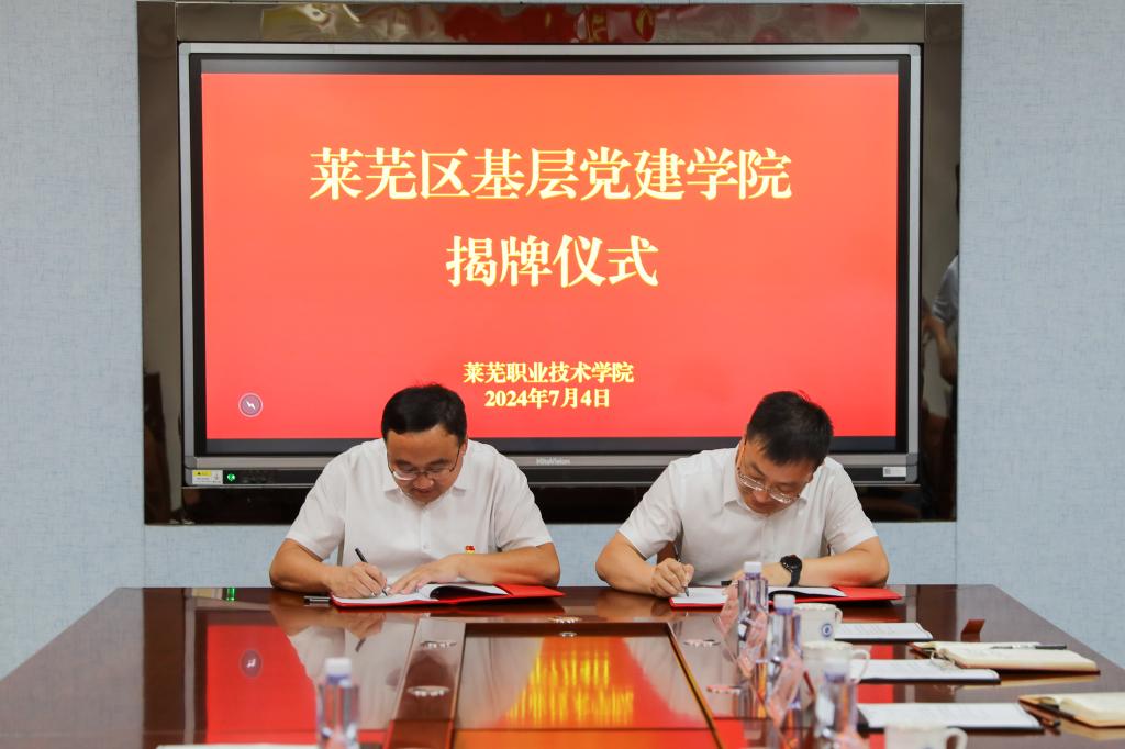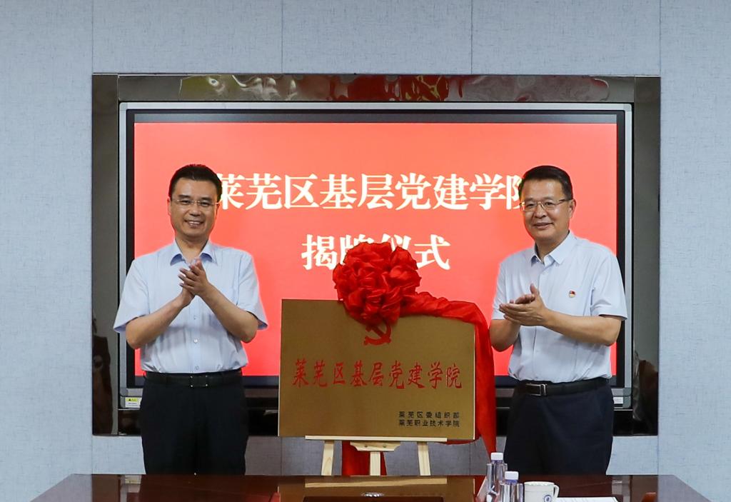 为深入贯彻习近平新时代中国特色社会主义思想,做好新时代的党建工作,学校与莱芜区委组织部创新校地党建合作的实践模式,联合成立莱芜区基层党建学院,为莱芜区基层党建工作增效赋能。7月4日下午,校地双方在学校联合举行莱芜区基层党建学院成立揭牌仪式,莱芜区委常委、组织部部长、统战部部长牟高飞,莱芜区委组织部副部长谷国瑞,学校党委书记孔祥敏,党委委员、副院长贾友军,党委委员、党委组织部(党委统战部)部长刘铖出席仪式。学校机关党委、思政教学部、继续教育部等部门主要负责人参加仪式。会议由贾友军主持。