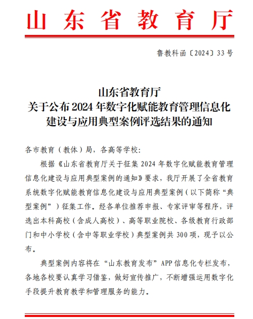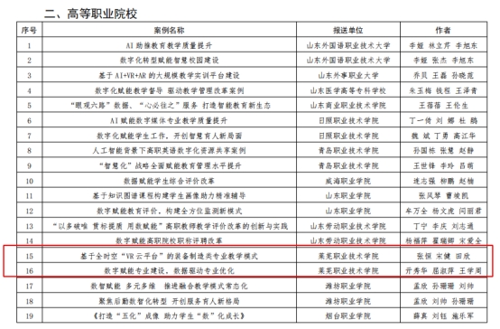 近日,山东省教育厅公布了2024年数字化赋能教育管理信息化建设与应用典型案例评选结果,学校报送的《基于全时空“VR云平台”的装备制造类专业教学模式》和《数字赋能专业建设,数据驱动专业优化》两个案例成功入选。