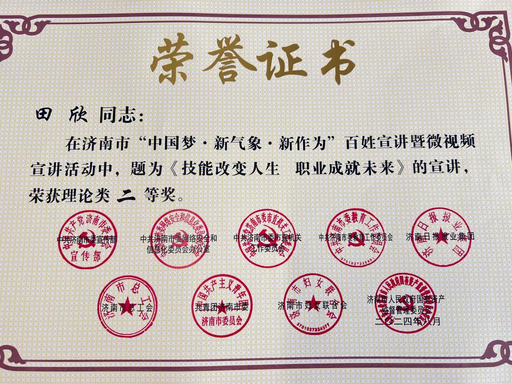 为深入贯彻落实习近平新时代中国特色社会主义思想,展现广大干部群众在新时代新征程上的崭新风貌和积极作为,济南市组织开展“中国梦·新气象·新作为”百姓宣讲比赛,学校智能制造系教师田欣获理论类宣讲二等奖。