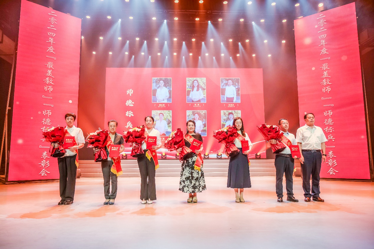 表彰会上,李允实宣读2024年学校“最美教师”和“师德标兵”评选结果,与会人员共同观看2024年“最美教师”视频短片。