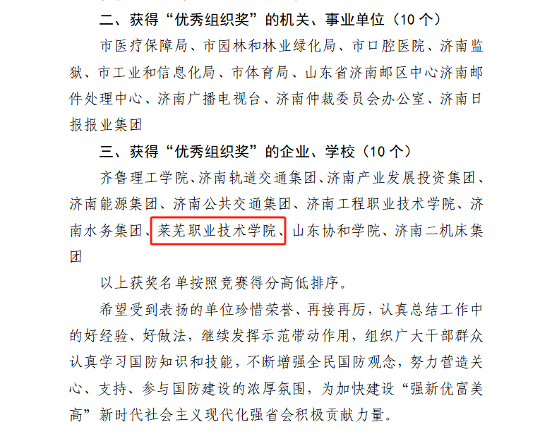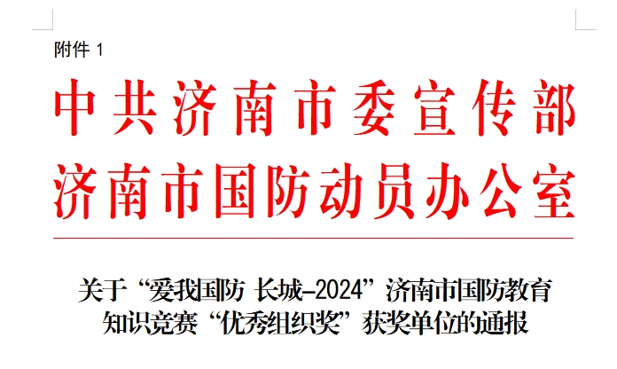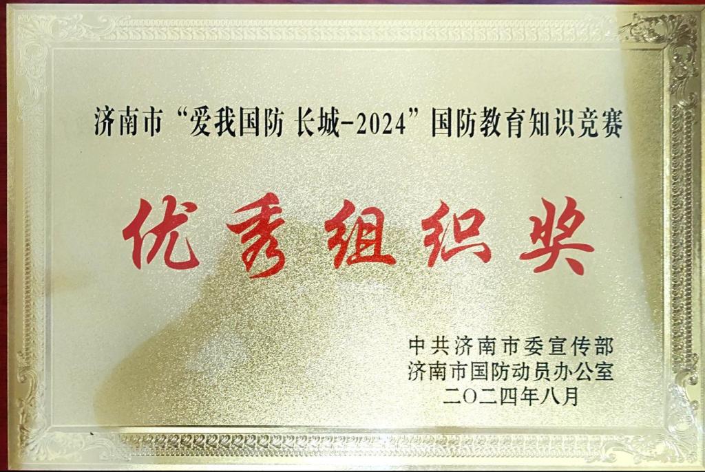 近日,学校在市委宣传部与市国防动员办公室联合组织的“爱我国防 长城-2024”济南市国防教育知识竞赛的中,再次荣获“优秀组织奖”,这一荣誉是对学校在国防教育领域所作出的不懈努力和取得的成绩的再次肯定。
