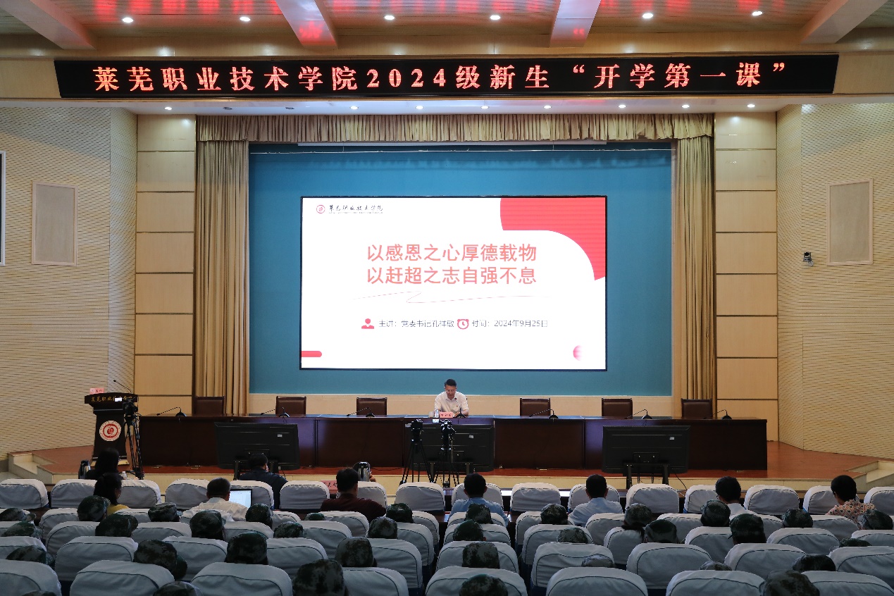 9月25日下午,学校党委书记孔祥敏以“以感恩之心厚德载物,以赶超之志自强不息”为主题为2024级新生讲授“开学第一课”。党委委员、副院长周美栋,党委委员、党委宣传部部长孙燕出席会议。4550余名师生在图信楼报告厅主会场和各系分会场同步聆听。会议由周美栋主持。