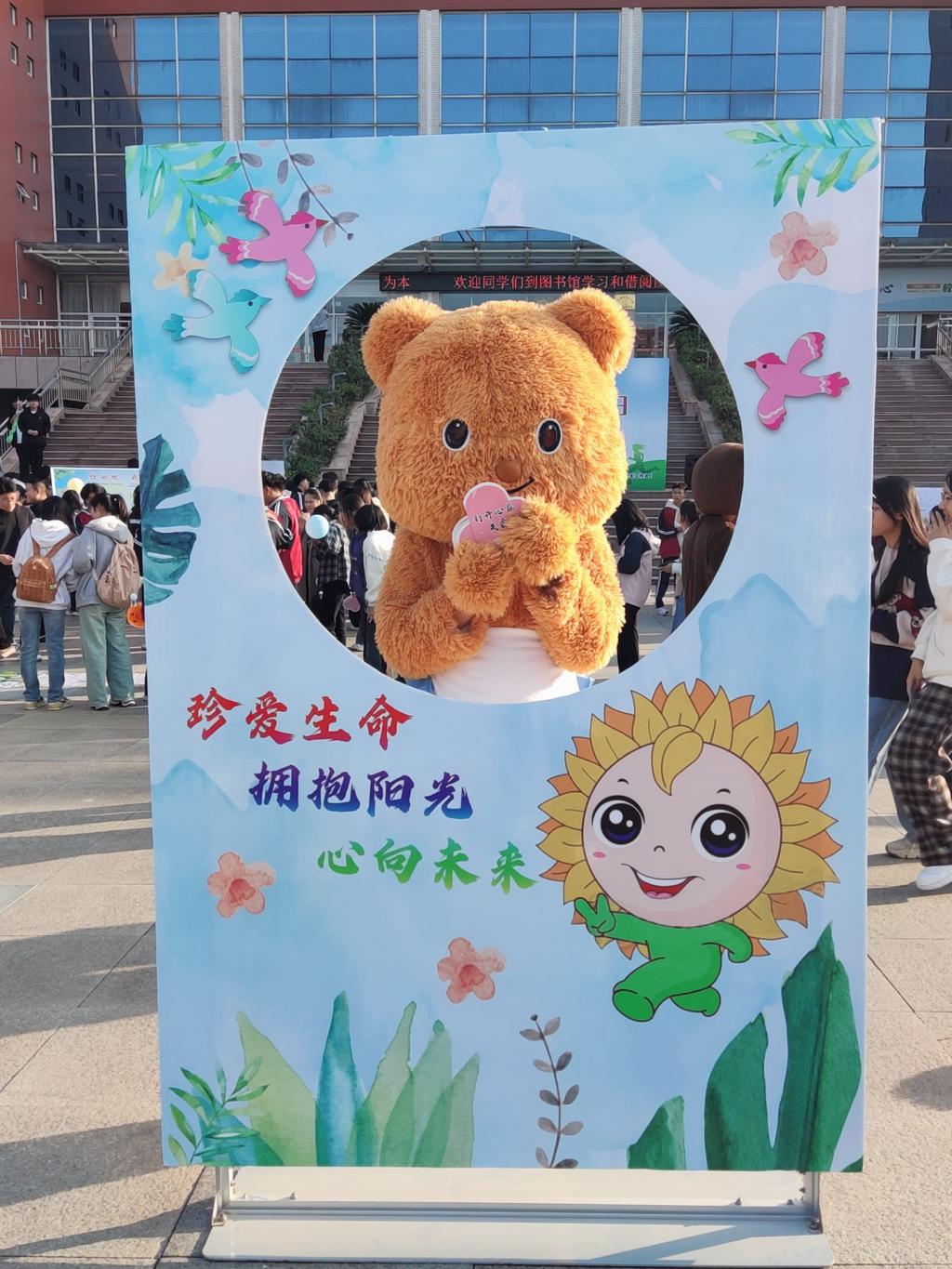活动现场精彩纷呈。可爱的小熊玩偶通过发放心理援助热线异形宣传卡,引导同学们主动关注自身心理问题,消除羞耻感,勇敢爱自己;笑脸签名活动通过彩色指纹签名的方式许下承诺,做自己心理健康的第一责任人;有奖问答和滚滚乐体验游戏通过轻松活泼的形式让同学们学习到有用的心理健康小知识,提高了自助互助能力。