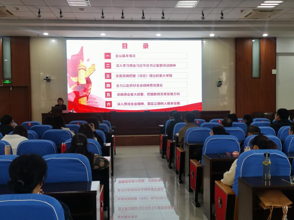 刘铖指出,学习宣传贯彻党的二十届三中全会精神是当前和今后一个时期的重大政治任务,全体教职工要认真学习领悟全会精神,准确把握其精神实质、核心要义和教育改革发展方向,深入贯彻全会精神,夯实担当作为思想根基,落实立德树人根本任务,切实把学习成果转化为干事创业的新思路新举措,为推动学校高质量发展贡献力量。