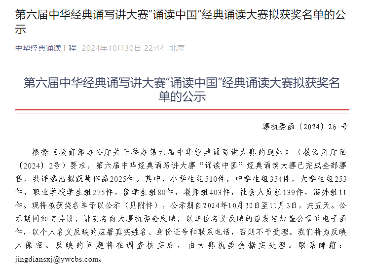 10月31日,中华经典诵写讲大赛执委会发布了第六届中华经典诵写讲大赛“诵读中国”经典诵读大赛拟获奖名单,学校药品食品系学生陶望鹏作品获得职业学校学生组国赛一等奖,实现了学校中华经典诵读大赛国赛奖项上零的突破。