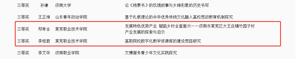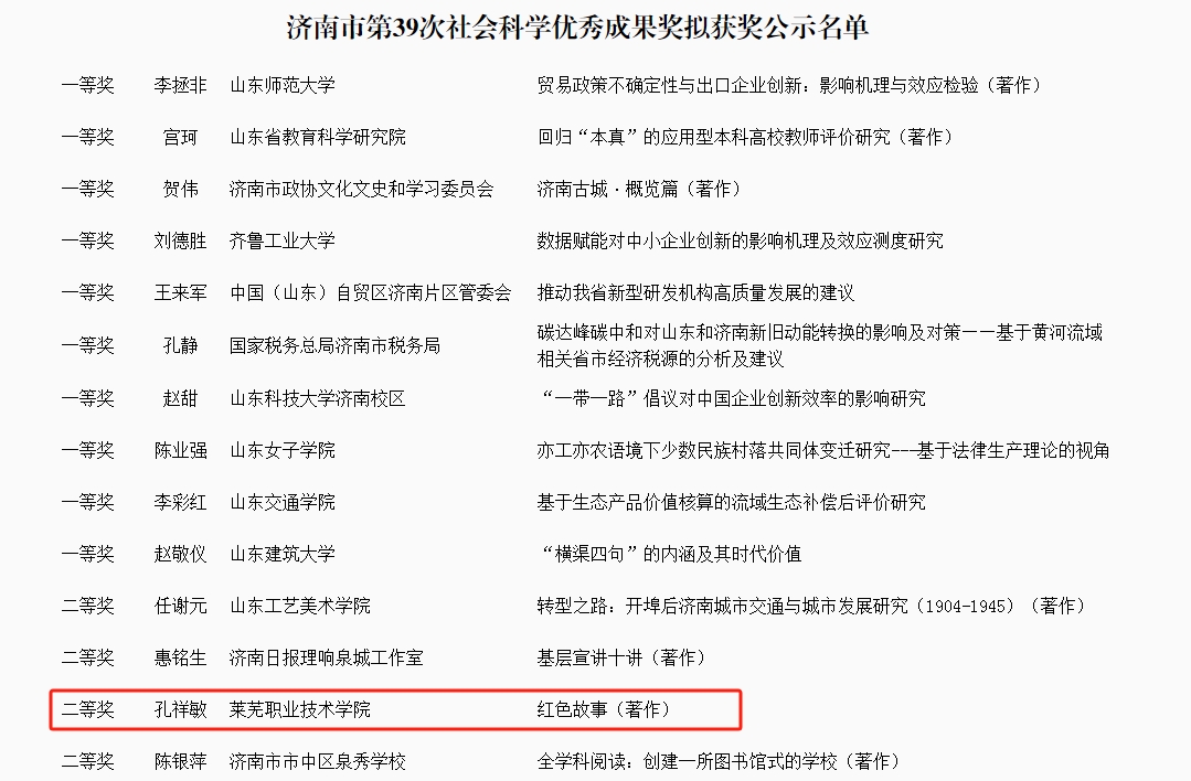 近日,济南市社会科学优秀成果奖评选委员会办公室公示了第39次社会科学优秀成果奖评审结果,学校党委书记孔祥敏《红色故事》获得二等奖,纪委办公室主任郑孝全《发展特色优势产业 赋能乡村全面振兴——济南市莱芜区大王庄镇竹园子村产业发展的探索与启示》和文物与艺术系李桂君《高职院校数字化教学资源库的建设思路研究》获三等奖。