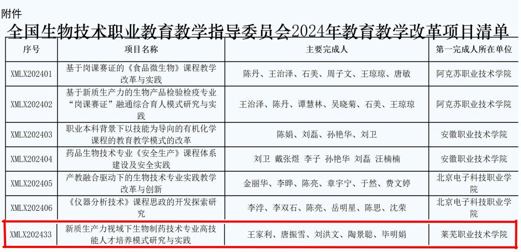 近日,全国生物技术职业教育教学指导委员会发布了《关于2024年教育教学改革项目立项的通知》,学校药品食品系主任王家利主持申报的项目《新质生产力视域下生物制药技术专业高技能人才培养模式研究与实践》(XMLX202433)获得立项。