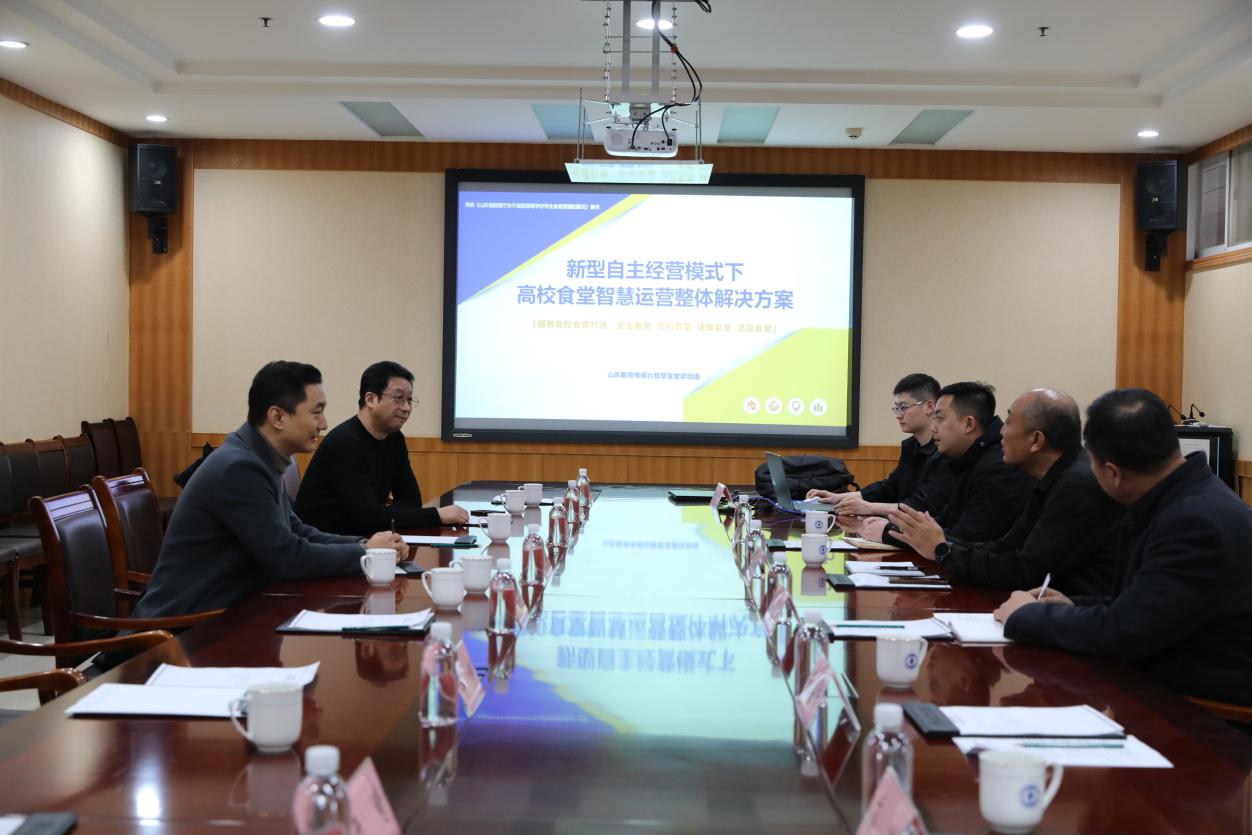 徐运国从办学历史、专业(群)建设、育人环境提升、国际交流与合作、人才培养、科学研究等方面介绍了学校办学治校基本情况。徐运国重点介绍了学校“一古一新一制药”专业建设、“无体育 不青春”校园文化品牌打造、服务乡村振兴国家战略等情况以及学校食堂运营管理、大宗食材招标采购等基本情况。他指出,高校智慧食堂已经成为高校餐饮的新趋势,运用数字化、信息化、智能化技术手段,将人工智能技术应用到高校食堂管理中,可以为广大师生提供更加便捷、高效、健康、节约的餐饮服务,给师生们带来前所未有的用餐体验。希望双方加强沟通与交流,不断提升校园食堂的运营效率和服务质量。