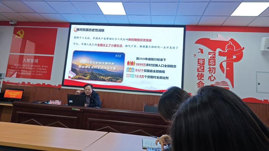 周美栋从中华人民共和国成立七十五周年华诞开篇,讲述了我国经济、政治、文化、社会、生态文明五个方面所取得的进步和发展。结合我国与国际社会最新发展的比较,通过对典型案例的具体分析,阐述了当今中国发展的优势,突出中国共产党领导的先进性和中国特色社会主义道路的优越性。