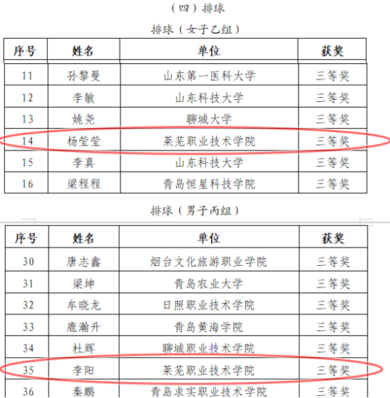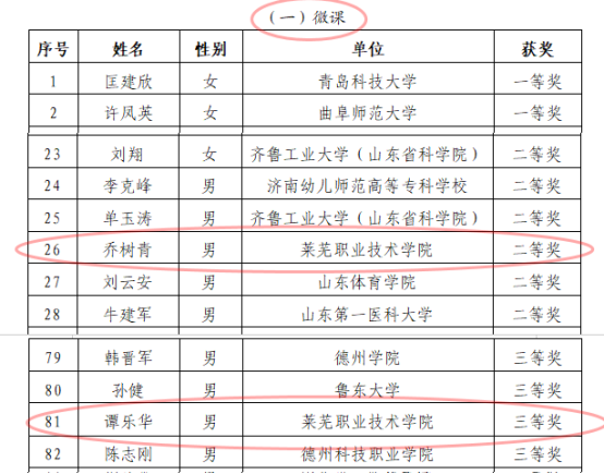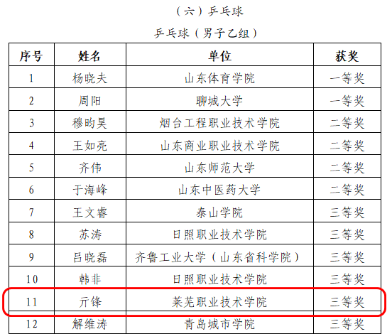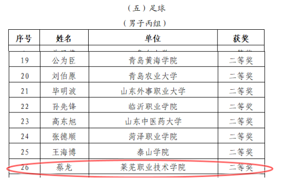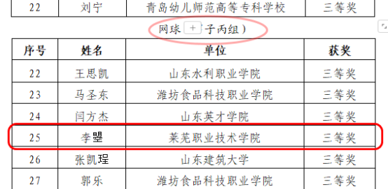 乔树青、谭乐华老师分获微课赛项二等奖、三等奖;蔡龙老师获足球(男子丙组)赛项二等奖;亓锋老师获乒乓球(男子乙组)赛项三等奖;杨莹莹老师获排球(女子乙组)赛项三等奖;李阳老师获排球(男子丙组)赛项三等奖;李曌获网球(男子丙组)赛项三等奖。
