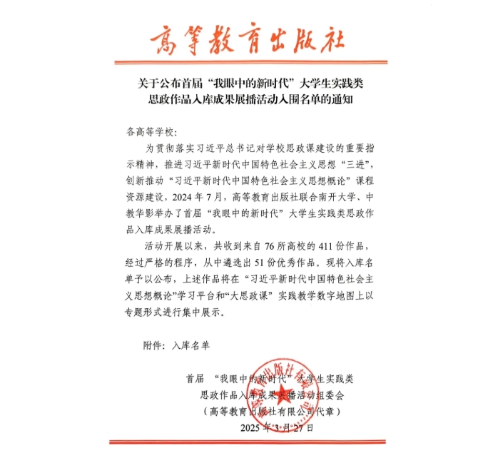 本次活动旨在贯彻落实习近平总书记对学校思政课建设的重要指示精神,深入推进习近平新时代中国特色社会主义思想进教材、进课堂、进头脑,创新推动高校思政课课程资源建设。活动自2024年7月启动以来,共收到来自全国76所高校的411份作品。经过专家严格评审,最终遴选出51份优秀作品进行展播。此次学校作品入围首届“我眼中的新时代”大学生实践类思政作品,是对学校思政课建设工作的高度肯定。下一步,思政教学部将持续深化思政课改革创新,进一步推动习近平新时代中国特色社会主义思想“三进”工作走深走实,努力培养更多堪当民族复兴大任和社会主义现代化建设重任的时代新人。