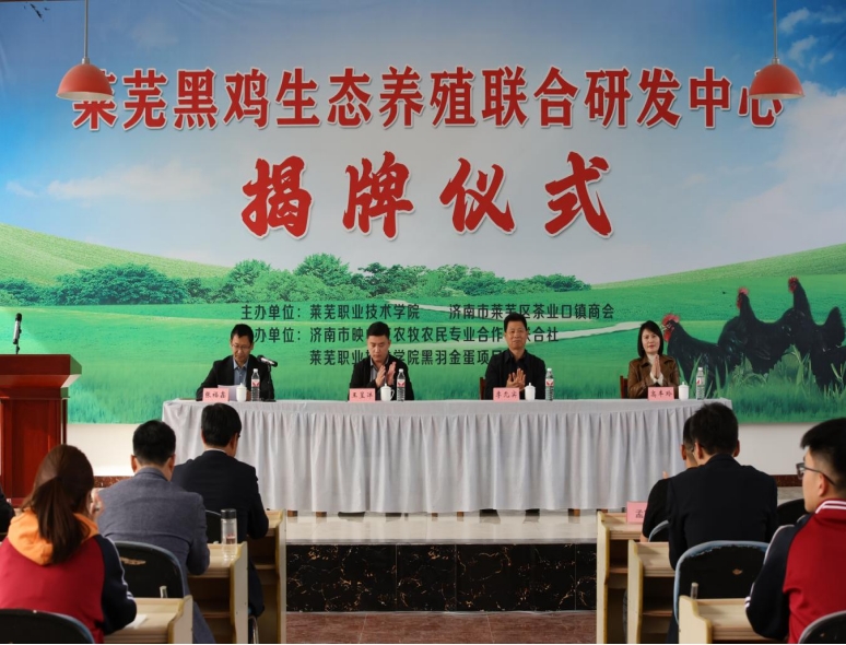 4月15日下午,学校在济南市映山红农牧农民专业合作社联合社举行莱芜黑鸡生态养殖联合研发中心揭牌仪式。学校党委副书记李允实,济南市莱芜区茶业口镇党委副书记、政协委员联络室主任王呈洋及相关企业、合作社负责人参加活动。