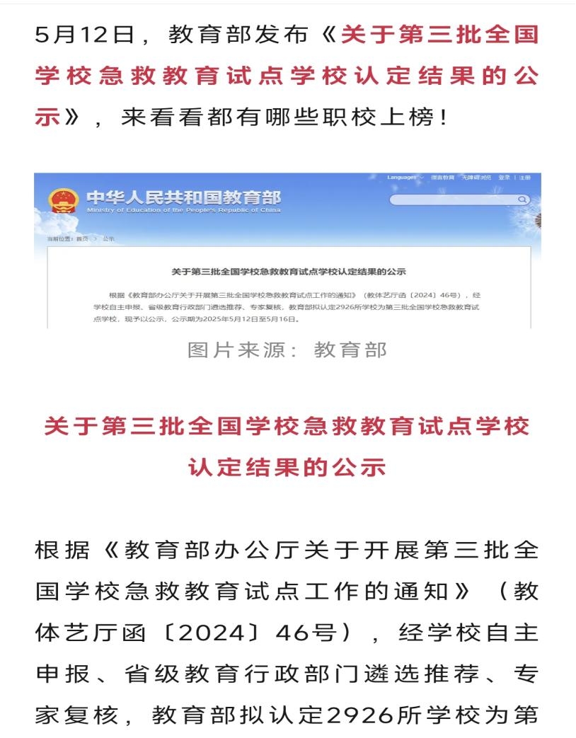 近日,教育部公示了第三批全国学校急救教育试点学校名单,学校凭借在急救教育领域的突出贡献与扎实基础,成功入选,标志着学校在校园急救教育领域迈入新阶段。