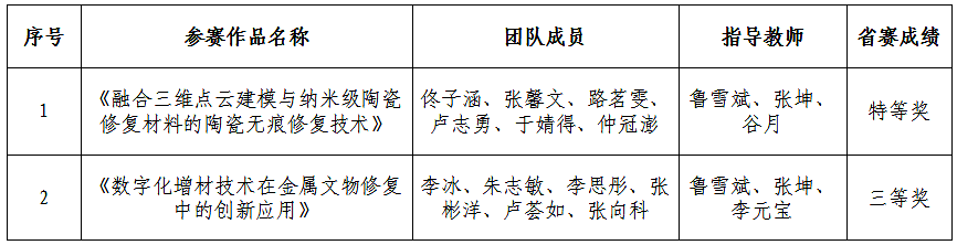 5月24日到25日,第十九届“挑战杯”山东省大学生课外学术科技作品竞赛在山东科技职业学院举行,学校文物与艺术系教师鲁雪斌、张坤指导的项目《融合三维点云建模与纳米级陶瓷修复材料的陶瓷无痕修复技术》获特等奖,《数字化增材技术在金属文物修复中的创新应用》获三等奖。