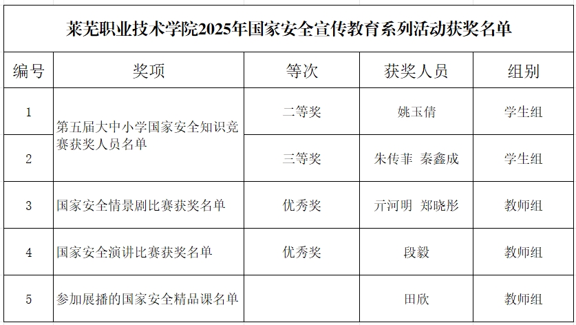 在第五届国家安全知识竞赛高校组的比拼中,人工智能系姚玉倩,智能汽车与建筑工程系朱传菲、智慧商贸与旅游系秦鑫成分别荣获学生组二、三等奖。教师组推选的作品中,亓河明、郑晓彤指导的情景剧《守护》在国家安全情景剧比赛高校组中荣获优秀奖;段毅指导的演讲作品《以青春之名 守护国之大者》荣获优秀奖;智能制造系田欣的《文化自信与文化安全》成功入选参加展播的国家安全精品课名单(高校组)。
