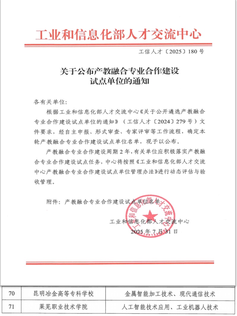 近日,工业和信息化部人才交流中心正式公布了“产教融合专业合作建设试点单位”名单,学校人工智能技术应用与工业机器人技术两个专业成功入选。