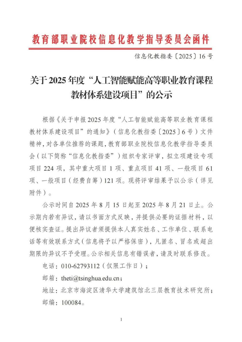 近日,教育部职业院校信息化教学指导委员会(以下简称“信息化教指委”)公布了2025年度“人工智能赋能高等职业教育课程教材体系建设项目”入选名单,学校《人工智能赋能大数据与会计专业教材建设研究》等4个项目入选,其中资助项目1个。
