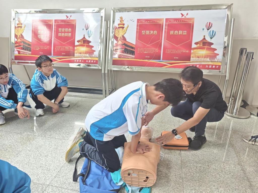 培训中,团队结合真实急救案例,用通俗易懂的语言讲解心肺复苏的重要性、操作流程及注意事项,重点演示胸外按压、开放气道、人工呼吸等关键步骤,强调按压深度、频率等核心要点。在实操环节,团队分组指导,手把手纠正动作细节,确保每位学员都能规范掌握操作技巧。高一新生安全员们热情高涨,认真练习,积极提问,现场学习氛围浓厚。