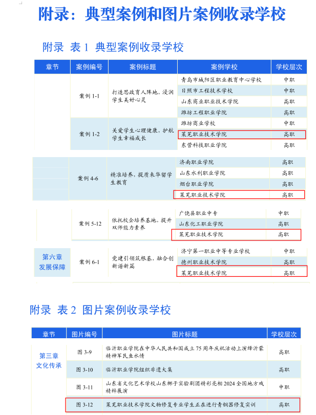 近日,山东省教育厅官网正式发布《山东省职业教育质量报告(2024 年度)》,学校《创新党建工作模式 探索“党建+”深度融合新路径》《“心连360°”品牌建设 护航学生心理健康》《精准培养 提质来华留学生教育》《探索人才引育新模式 提升双师能力素养》4个典型案例,《文物修复与保护专业学生正在进行青铜器修复实训》1个图片案例成功入选,充分展现了学校在职业教育领域的特色实践与育人成效。