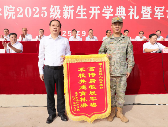 闭营仪式上,学校向莱芜区武装部赠送锦旗,对2025级学生军训工作先进集体教育系、药品食品系、智慧商贸与旅游系进行了表彰。教师代表、毕业生代表、新生代表褚峻豪分别进行发言。