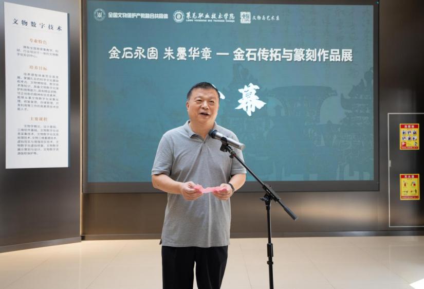 10月1日上午,“金石永固,朱墨华章——金石传拓与篆刻作品展”在学校文物与艺术系开幕。本次展览由全国文物保护产教融合共同体指导,学校主办,文物与艺术系承办。展期为期七天,集中呈现学校外聘教授吕夫永、文物与艺术系专业教师李萍萍在金石传拓与篆刻领域的精湛艺术成果,为文化遗产保护传承与职业教育文化育人提供生动实践样本。济南市莱芜区副区长韩冰,中国书法家协会理事、山东省书法家协会副主席靳永,学校党委副书记、院长徐运国出席开幕式。开幕式由文物与艺术系党支部书记、主任王金玲主持。