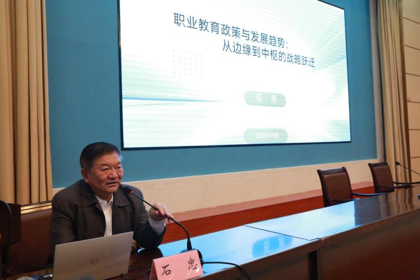 开班式后,石忠以《职业教育政策与发展趋势》为题作培训首讲。他系统梳理了国家职业教育改革顶层设计与政策脉络,重点围绕“产教融合”这一核心议题展开深入解析,帮助参训教师进一步明晰职业教育发展方向、增强工作信心。讲座内容翔实、阐释生动,现场反响热烈,掌声不断。